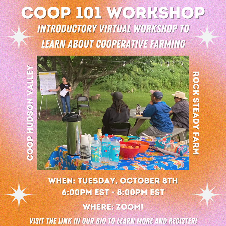 Are you excited by the idea of owning a business with others? Are you curious about co-ops? Whether you are new to co-ops or are early in your journey of starting any type of cooperative project, join Rock Steady Farm team members and co-op developers from Co-op Hudson Valley to learn more about how the worker-owned cooperative model works!